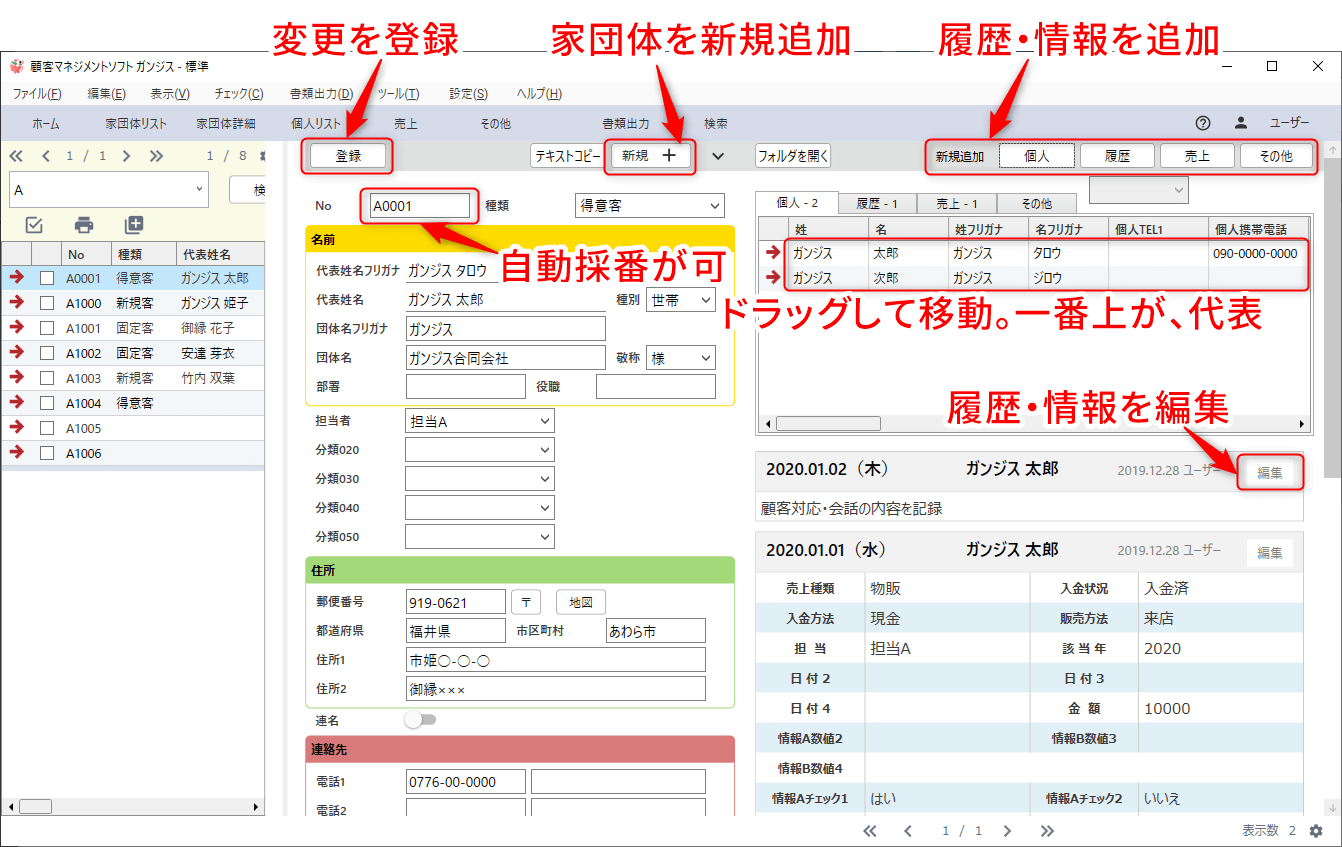 ガンジスの特徴として、家(世帯)・団体で管理します。画面は家団体画面です。この家団体の記録に、個人情報の記録を追加します。