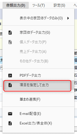 - メニューから、書類出力>項目を指定して出力をクリックします。