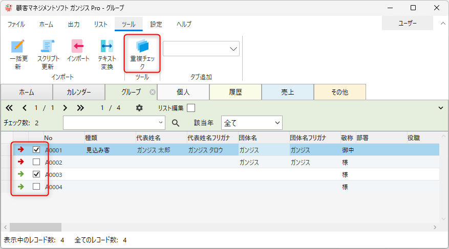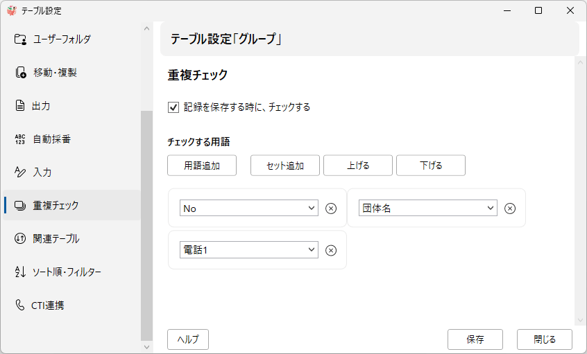 テーブル「グループ」の初期設定では、No、団体名、電話1のいずれかが、一致すると重複していると判定します。
