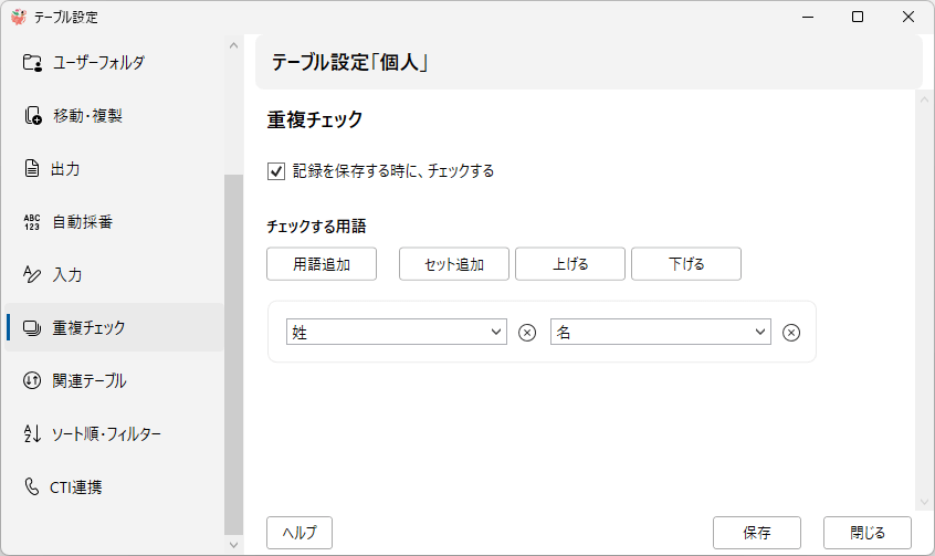 テーブル「個人」の初期設定では、姓と名が、一致すると重複していると判定します。