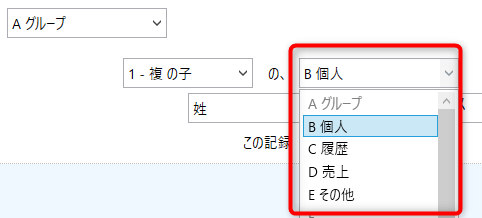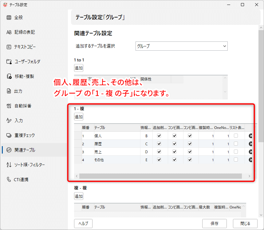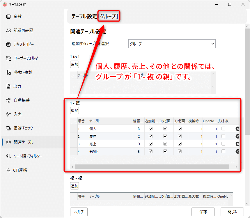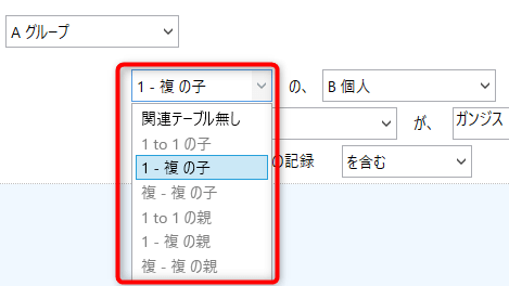 画像の例では、テーブル「個人、履歴、売上、その他」は、テーブル「グループ」の、1 - 複 の子になります。