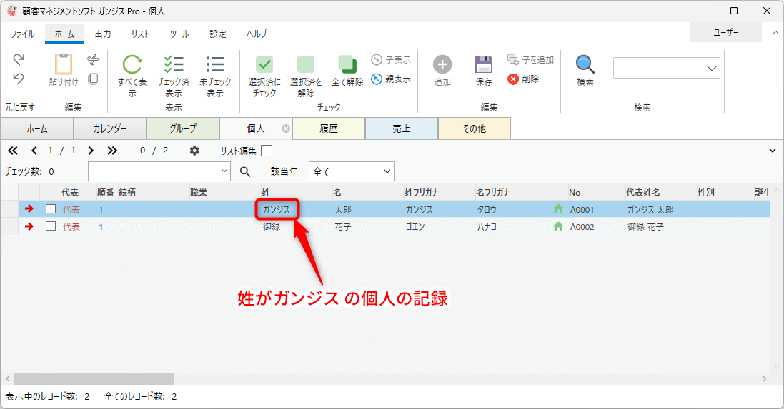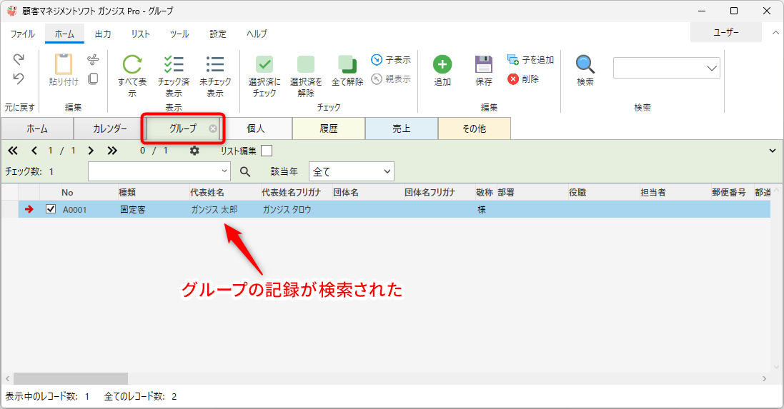 検索を実行すると、この個人の記録が「1 - 複の子」として有るグループの記録が表示されます。