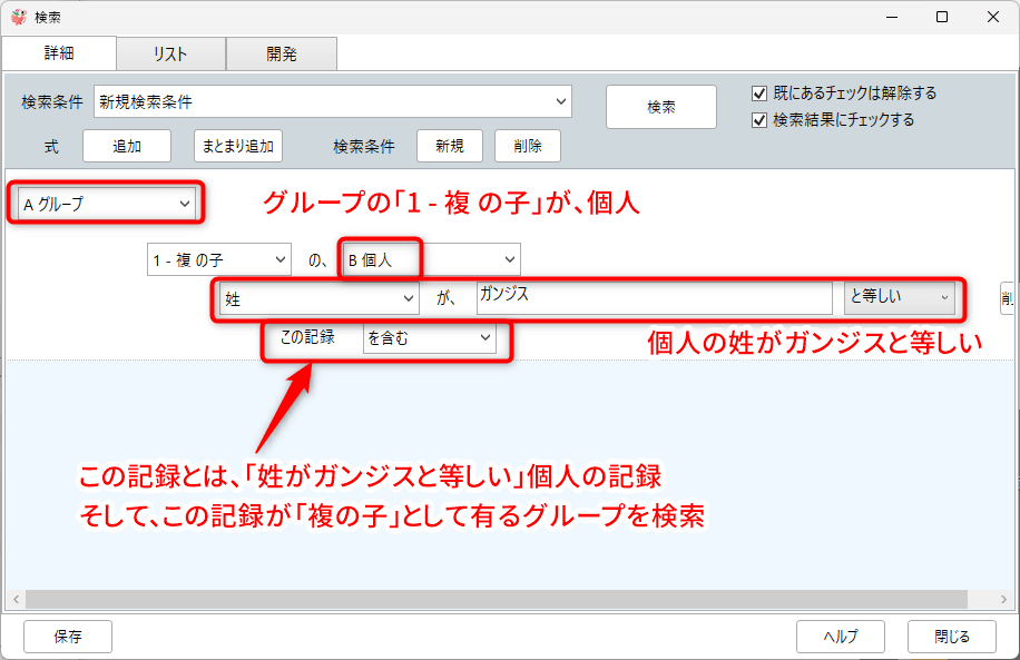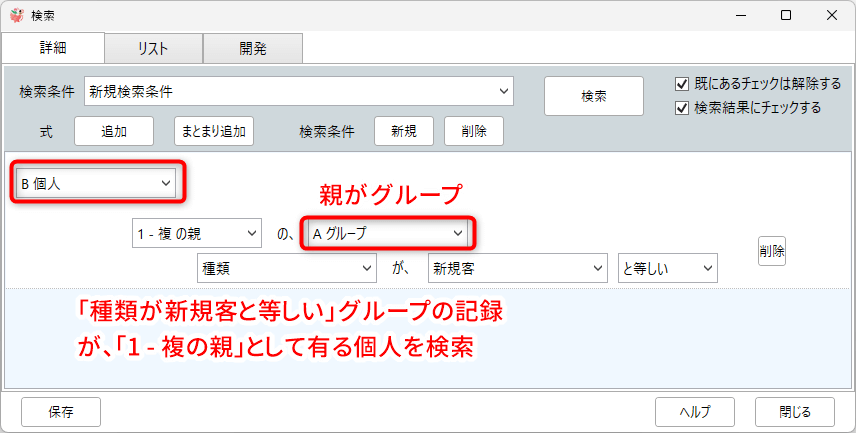 - 検索の式の条件は、次になります。検索対象は、あくまでも、個人です。