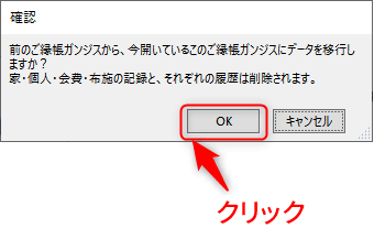 データ移行先の、家・個人・会費・布施の記録と、それぞれの履歴は削除されます。